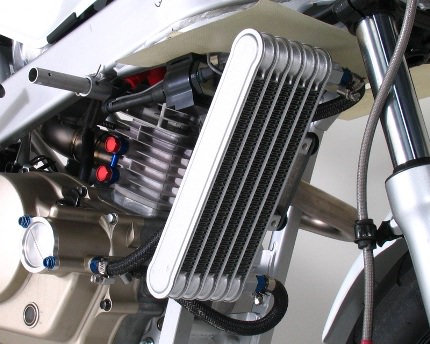 ボアアップをはじめとして、ハイチューンされたエンジンの必需品。高回転・高性能化したエンジンはその代償として膨大な熱を発し、ノーマルのままでは、オーバーヒート・焼き付き等、破損する場合がありますので、オイルクーラーの装着をお薦めします。スーパーオイルクーラーKITは400ccクラスのオイルクーラーと同等の放熱量(5段コア)を誇り、レースを始め炎天下等の苛酷な条件下でも、安定したエンジン性能を発揮します。車種専用ステー付属。ボルトオン装着が可能です。(注:タンクやクラッチ等、その付近のアクセサリーパーツ等を同時装着している場合は取付ステーの変更または加工が必要な場合があります。)オイルクーラーにはホース取り回し自由度が高いユニオンボルトを採用。またユニオンボルトには、カラーアルマイト処理済み。コンデンサー内オイル容量 150cc(5段コア) 75cc(3段コア)コンデンサーは必ず取付説明書の通りに装着して下さい。ユニオンニップル側を下向けに装着すると、油圧が低下しシリンダーヘッドの潤滑不足につながります。ホースには内径φ6.2、外径φ12.6の外層ブレードホースを採用。高耐圧と高耐久性を誇ります。オイルラインの取出しはシリンダーもしくはキタコ製ULTRAクラッチカバーです。5段コアコンデンサー※大容量オイルポンプとの併用をお薦めします。※キタコ製ボアアップKIT115cc/ULTRAクラッチカバー用【セット内容】オイルクーラーコンデンサー(5 段) ×1ユニオンボルト(レッド) ×4ユニオンニップル(ブルー) ×4アルミバンジョーボルト/ワッシャー ×8ステンレスバンド(φ8-12) ×4オイルクーラーホース100cm ×1コンデンサーステー ×1キャップボルト M6×18 ×2ワッシャー(6.5×16×1.6) ×4グロメット(7.5×9×7.5) ×2グロメットカラー(6.2×7.5×7) ×2キャップボルト M6×35 ×2平ワッシャー 6mm ×2スプリングワッシャー 6mm ×2ナット M6×2