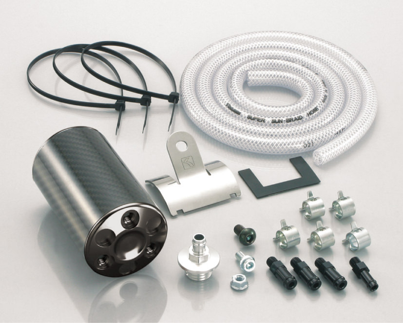 ピストン運動のさまたげとなるケース内部の圧力をシリンダータペットとケースブリーザーから取り出し、パワーロスとクランクケース内の温度上昇を低減します。同時に吹き出るオイルをキャッチタンクが確実に受け止め、圧力のみを大気放出、オイルはフィラーキャップ側にリターンさせる4ストロークエンジンの定番のチューニングパーツです。アルミ製カーボン巻のキャッチタンクボトルを採用。ボトルキャップ部分はアルミ削り出し、アルマイト仕上げとなっています。外径×ボトル長:φ63×115mm 容量:220cc※右側サイドカバー使用不可※ノーマルエアクリーナー使用不可