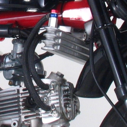 ボアアップをはじめとして、ハイチューンされたエンジンの必需品。高回転・高性能化したエンジンはその代償として膨大な熱を発し、ノーマルのままでは、オーバーヒート・焼き付き等、破損する場合がありますので、オイルクーラーの装着をお薦めします。レースを始め炎天下等の苛酷な条件下でも、安定したエンジン性能を発揮します。車種専用ステー付属。ボルトオン装着が可能です。(注:タンクやクラッチ等、その付近のアクセサリーパーツ等を同時装着している場合は取付ステーの変更または加工が必要な場合があります。)オイルクーラーにはホース取り回し自由度が高いユニオンボルトを採用。またユニオンボルトには、カラーアルマイト処理済み。コンデンサー内オイル容量75cc(3段コア)コンデンサーは必ず取付説明書の通りに装着して下さい。ユニオンニップル側を下向けに装着すると、油圧が低下しシリンダーヘッドの潤滑不足につながります。ホースには内径φ6.2、外径φ12.6の外層ブレードホースを採用。高耐圧と高耐久性を誇ります。3段コアコンデンサー※大容量オイルポンプとの併用をお薦めします。※取出し口はRシリンダーヘッドサイドカバーです。【セット内容】オイルクーラー取り出しASSY ×1オイルクーラーコンデンサー(3段) ×1ユニオンボルト(レッド) M10×P1.25 ×2ユニオンニップル(ブルー) ×2バンジョーアルミワッシャー 10mm ×4ホースバンドW9 #16 φ10~ 16 ×4オイルホース 60cmコンデンサーステー ×1グロメットカラー 6.2×7.5×7 ×2グロメット 7.5×9×7.5 ×2ワッシャー 6.5×16×1.6 ×4U ボルト 6×64×75L ×1ナット M6×2ワッシャー 6mm ×2キャップボルト M5×10 ×2(+)トラスビス M6×25 ×2ナット M5 ×2