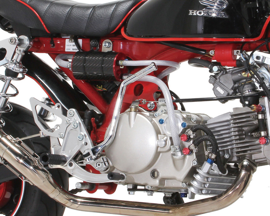 ピストン運動のさまたげとなるケース内部の圧力をシリンダータペットとケースブリーザーから取り出し、パワーロスとクランクケース内の温度上昇を低減します。同時に吹き出るオイルをキャッチタンクが確実に受け止め、圧力のみを大気放出、オイルはフィラーキャップ側にリターンさせる4ストロークエンジンの定番のチューニングパーツです。アルミ製カーボン巻のキャッチタンクボトルを採用。ボトルキャップ部分はアルミ削り出し、アルマイト仕上げとなっています。 外径×ボトル長:φ63×115mm 容量:220cc※ノーマルマフラー、アップタイプマフラーの装着はできません。ダウンタイプマフラー装着車専用です。※本体はタイラップ取付となりますので、装着箇所次第で様々なモンキー系エンジン車にも使用できます。