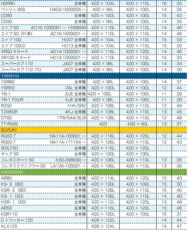 江沼チェーンとの共同開発によって開発した420サイズ最軽量の低フリクションドライブチェーンです。徹底した軽量化とノンシール構造により、フリクションロスを抑え、エンジンパワーをダイレクトに伝達します。ジョイントクリップ接合タイプ1ヶ付属画像の適合表をご確認くださいませ。仕様:420サイズ×110リンク