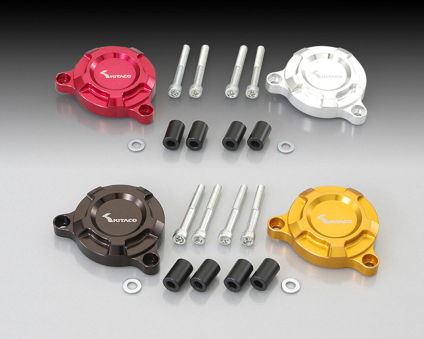 セルモーターも削り出しでドレスアップ。お洒落にアルミ削り出しでセルモーターをカバー。アルミ削り出しアルマイト仕上げ装着ボルト、カラー付属