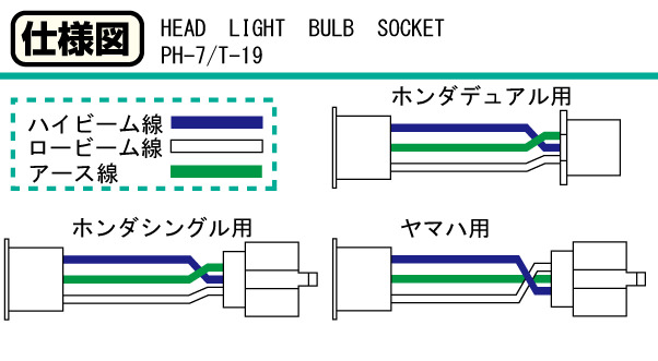 キタコ製ヘッドライトに適合する補修用ヘッドライトソケットです。各バルブ、各車用に設定していますので、お間違えのないようにご確認下さい。PH-7/T-19バルブ対応ホンダデュアル車(汎用)
