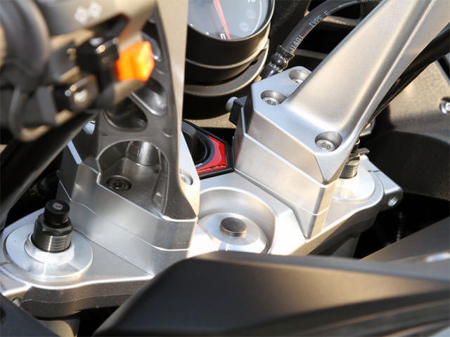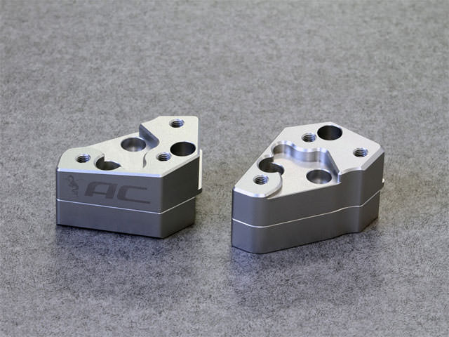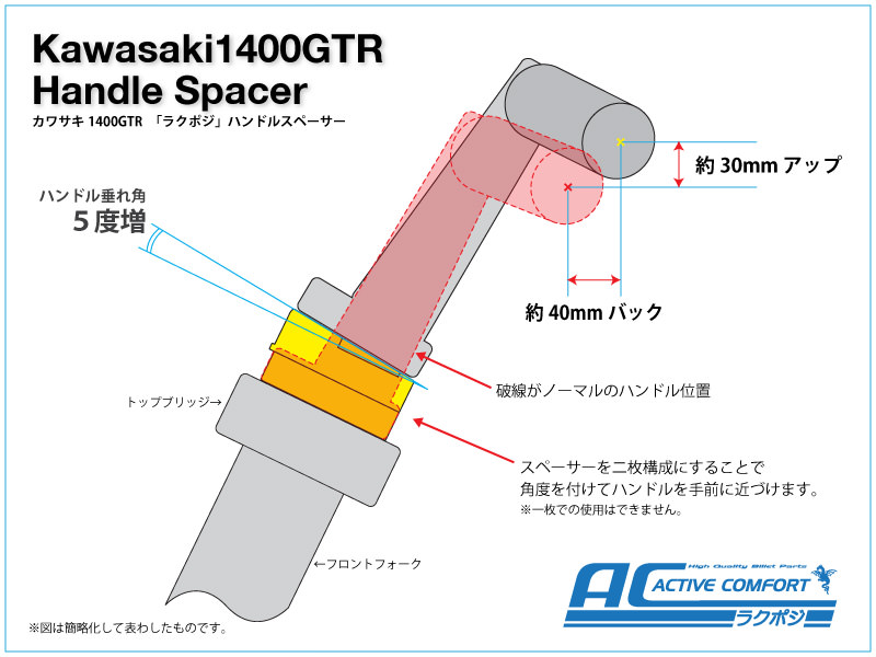 ※ABS仕様車はホース、ハーネス類の交換不要。ABSが装備されていない車両に取り付ける場合はホース、ハーネス類を交換する必要があります。ノーマルハンドル比:40mmバック、30mmアップ高さの調整はできません。欧米の客層を意識した大柄な車体の1400GTRはルックスの重量感に反してとても軽快でツーリング性能だけでなく非常に高いスポーツ性能をも持ち合わせたオートバイです。ハンドル形状などを見ると、一見楽そうに感じるのですが跨るとややハンドルが遠くて体を前に近づけざるをえないポジションです。それを解消するために開発したのが「ラクポジ」ハンドルスペーサーです。厚みのある板を挟み込むだけの一般的なスペーサーでは板厚の分だけ斜め上にハンドル位置が移動するだけです。それに対し「ラクポジ」ハンドルスペーサーはスペーサーを二枚構造にし、よりハンドルを手前に寄せるためにスペーサーに5度の角度をつけました。これによってハンドルを上げ過ぎることなく、手前に近づけることを可能にしているのです。(※スペーサーは一枚では使用できません)