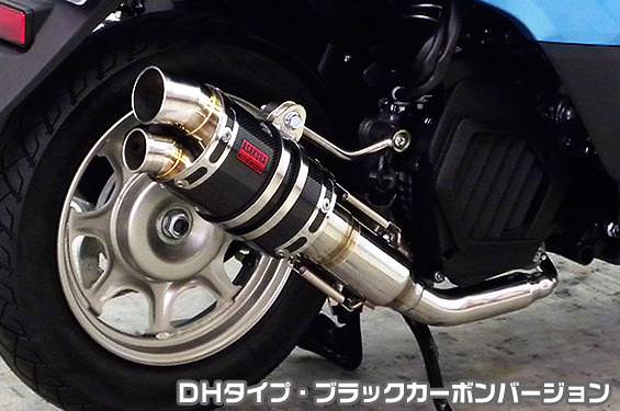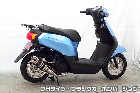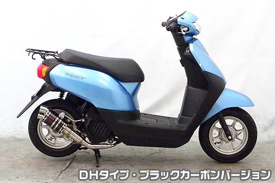 ※受注生産のため、商品のお届けまで2週間程度お時間をいただきます。ご了承くださいませ。※平成22年4月1日より施行された認証制度に適合する認証マフラーではありません。ご理解の程よろしくお願い致します。タクト用 ZZRタイプマフラー DHタイプ ブラックカーボンバージョンです。新時代から導き出された究極のイノベーションデザインで非常にインパクトあるマフラーです。サイレンサーはブラックカーボンバージョンです。ブラックカーボンバージョンは、ステンレスサイレンサーにカーボンシートを巻いた仕様で、耐久性が抜群に高い構造を採用しています。【DHタイプ】排気口は大小2本出しでステンレス削りだし部材を採用消音用のバッフルが2個装備されている【ダブルバッフル仕様】となっており、バッフル無し、バッフル1個装着、バッフル2個装着と3種類の排気音を選べるサウンドセレクトスタイルになっています。バッフルはステンレスタイプとアルミタイプの2種類のバッフルが装備されています。音量はバッフル2個装着時の排気音量が 約82db(法定規制値内音量)、バッフル1個装着時の排気音量が 約84db、バッフル非装着時の排気音量が 約87db です。 音質も耳障りな音でなく重低音のサウンドになっていますので、ノーマルマフラーではちょっと物足りない方にオススメです。サイレンサーはストレート構造ではなく隔壁構造になっていますので、音量は静かめに抑えられており近所迷惑になる事無く安心して走行できます。低中速を落とすことなく高回転でスムーズに回り扱いやすい設定になっています。振動防止のためサイレンサーとエキパイが2分割となる安心設計になっています。サイレンサーは、2点止めになっていますのでしっかりと固定でき、耐久性にも優れています。無加工ボルトオンにて装着できますので、必要な工具があれば簡単に取り付けできます。(取り付けに必要なボルト類は全て付属しております。)サイレンサーバンドにはスリットタイプを採用してデザインにもこだわっています。サイレンサーの固定にはサイレンサーバンドを採用し、バフ仕上げを施したステンレス製丸棒で組んだステーを介して固定しておりますので、従来のステーの固定より車体と調和した高級感あふれるマフラーです。オールステンレス製で、エキパイからサイレンサーまでバフ仕上げを施しています。ローダウンにも対応しておりますので、安心してご使用下さい。