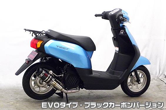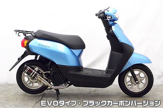 ※受注生産のため、商品のお届けまで2週間程度お時間をいただきます。ご了承くださいませ。※平成22年4月1日より施行された認証制度に適合する認証マフラーではありません。ご理解の程よろしくお願い致します。タクト用 ZZRタイプマフラー EVOタイプ ブラックカーボンバージョンです。新時代から導き出された究極のイノベーションデザインで非常にインパクトあるマフラーです。サイレンサーは ブラックカーボンバージョンです。ブラックカーボンバージョンは、ステンレスサイレンサーにカーボンシートを巻いた仕様で、耐久性が抜群に高い構造を採用しています。【EVOタイプ】アルミ素材から削り出したビレットタイプのエンドに、ブラックアルマイト処理を施した消音用のバッフルが2個装備されている【ダブルバッフル仕様】となっており、バッフル無し、バッフル1個装着、バッフル2個装着と3種類の排気音を選べるサウンドセレクトスタイルになっています。バッフルはステンレスタイプ(EVOタイプはプレートタイプ)とアルミタイプの2種類のバッフルが装備されています。音量はバッフル2個装着時の排気音量が 約82db(法定規制値内音量)、バッフル1個装着時の排気音量が 約84db、バッフル非装着時の排気音量が 約87db です。 音質も耳障りな音でなく重低音のサウンドになっていますので、ノーマルマフラーではちょっと物足りない方にオススメです。サイレンサーはストレート構造ではなく隔壁構造になっていますので、音量は静かめに抑えられており近所迷惑になる事無く安心して走行できます。低中速を落とすことなく高回転でスムーズに回り扱いやすい設定になっています。振動防止のためサイレンサーとエキパイが2分割となる安心設計になっています。サイレンサーは、2点止めになっていますのでしっかりと固定でき、耐久性にも優れています。無加工ボルトオンにて装着できますので、必要な工具があれば簡単に取り付けできます。(取り付けに必要なボルト類は全て付属しております。)サイレンサーバンドにはスリットタイプを採用してデザインにもこだわっています。サイレンサーの固定にはサイレンサーバンドを採用し、バフ仕上げを施したステンレス製丸棒で組んだステーを介して固定しておりますので、従来のステーの固定より車体と調和した高級感あふれるマフラーです。オールステンレス製で、エキパイからサイレンサーまでバフ仕上げを施しています。ローダウンにも対応しておりますので、安心してご使用下さい。