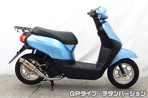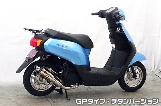 ※受注生産のため、商品のお届けまで2週間程度お時間をいただきます。ご了承くださいませ。※平成22年4月1日より施行された認証制度に適合する認証マフラーではありません。ご理解の程よろしくお願い致します。タクト用 ZZRタイプマフラー GPタイプ チタンバージョンです。新時代から導き出された究極のイノベーションデザインで非常にインパクトあるマフラーです。サイレンサーは チタンバージョンです。チタンバージョンは軽量高剛性なチタニウム製パイプにレインボーの焼き色を付けた、非常に高級感の高い仕上がりです。【GPタイプ】EVOタイプ同様のブラックアルマイト処理を施したビレットタイプのテールマウントに、シンプルかつレーシーなイメージ消音用のバッフルが2個装備されている【ダブルバッフル仕様】となっており、バッフル無し、バッフル1個装着、バッフル2個装着と3種類の排気音を選べるサウンドセレクトスタイルになっています。バッフルはステンレスタイプとアルミタイプの2種類のバッフルが装備されています。音量はバッフル2個装着時の排気音量が 約82db(法定規制値内音量)、バッフル1個装着時の排気音量が 約84db、バッフル非装着時の排気音量が 約87db です。 音質も耳障りな音でなく重低音のサウンドになっていますので、ノーマルマフラーではちょっと物足りない方にオススメです。サイレンサーはストレート構造ではなく隔壁構造になっていますので、音量は静かめに抑えられており近所迷惑になる事無く安心して走行できます。低中速を落とすことなく高回転でスムーズに回り扱いやすい設定になっています。振動防止のためサイレンサーとエキパイが2分割となる安心設計になっています。サイレンサーは、2点止めになっていますのでしっかりと固定でき、耐久性にも優れています。無加工ボルトオンにて装着できますので、必要な工具があれば簡単に取り付けできます。(取り付けに必要なボルト類は全て付属しております。)サイレンサーバンドにはスリットタイプを採用してデザインにもこだわっています。サイレンサーの固定にはサイレンサーバンドを採用し、バフ仕上げを施したステンレス製丸棒で組んだステーを介して固定しておりますので、従来のステーの固定より車体と調和した高級感あふれるマフラーです。オールステンレス製で、エキパイからサイレンサーまでバフ仕上げを施しています。ローダウンにも対応しておりますので、安心してご使用下さい。
