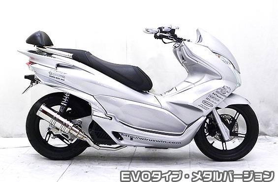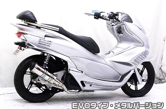 ※受注生産のため、商品のお届けまで2週間程度お時間をいただきます。ご了承くださいませ。※平成22年4月1日より施行された認証制度に適合する認証マフラーではありません。ご理解の程よろしくお願い致します。※初期モデル用※eSP(イーエスピー)エンジンには取り付けできませんのでご注意下さい。ご注文の際にはお間違えの無いようご注意下さい。PCX150(JBK-KF12)用 DDRタイプマフラー EVOタイプ メタルバージョンです。新時代から導き出された究極のイノベーションデザインで非常にインパクトあるマフラーです。サイレンサーは メタルバージョンです。メタルバージョンはステンレスをバフ磨きでピカピカに仕上げています。【EVOタイプ】アルミ素材から削り出したビレットタイプのエンドに、ブラックアルマイト処理を施した。消音用のバッフルが2個装備されている【ダブルバッフル仕様】となっており、バッフル無し、バッフル1個装着、バッフル2個装着と3種類の排気音を選べるサウンドセレクトスタイルになっています。バッフルはステンレスタイプ(EVOタイプはプレートタイプ)とアルミタイプの2種類のバッフルが装備されています。音量はバッフル2個装着時の排気音量が 約85db(法定規制値内音量)、バッフル1個装着時の排気音量が 約87db、バッフル非装着時の排気音量が 約89db です。音質も耳障りな音でなく重低音のサウンドになっていますので、ノーマルマフラーではちょっと物足りない方にオススメです。サイレンサーはストレート構造ではなく隔壁構造になっていますので、音量は静かめに抑えられており近所迷惑になる事無く安心して走行できます。低中速を落とすことなく高回転でスムーズに回り扱いやすい設定になっています。振動防止のためサイレンサーとエキパイが2分割となる安心設計になっています。サイレンサーは、2点止めになっていますのでしっかりと固定でき、耐久性にも優れています。無加工ボルトオンにて装着できますので、必要な工具があれば簡単に取り付けできます。(取り付けに必要なボルト類は全て付属しております。)サイレンサーバンドにはスリットタイプを採用してデザインにもこだわっています。サイレンサーの固定にはサイレンサーバンドを採用し、バフ仕上げを施したステンレス製丸棒で組んだステーを介して固定しておりますので、従来のステーの固定より車体と調和した高級感あふれるマフラーです。オールステンレス製で、エキパイからサイレンサーまでバフ仕上げを施しています。ローダウンにも対応しておりますので、安心してご使用下さい。
