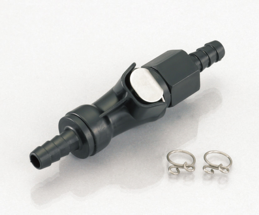 フュエルタンクの脱着時に非常に便利なフュエルホースジョイントです。フュエルホースに中継させるだけで、ワンタッチで脱着可能。フューエルコックやキャブレターからホースを引き抜く手間が省けます。ホースクリップ2ヶ付属