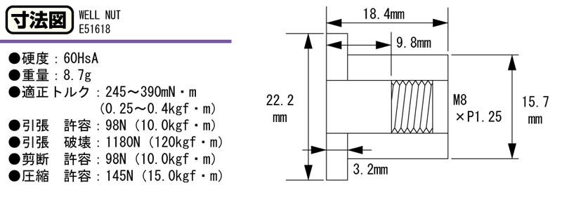 各メーカー純正指定品ウェルナットはクロロプレンゴムに黄銅ナットを埋め込んだ締結部品です。片側のネジ締めだけで取付けるとともに、ゴムの特性を活かした効果が得られます。〔特徴〕、防振効果 、液体・気体のシール効果 、吸音効果 、絶縁効果 その他金属性ナットにない多くの特性を有しております。硬度:60HsA重量:8.7g適正トルク:245~390mN・m(0.25~0.4kgf・m)引張 許容:98N(10.0kgf・m)引張 破壊:1180N(120kgf・m)剪断 許容:98N(10.0kgf・m)圧縮 許容:145N(15.0kgf・m)