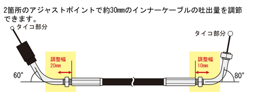 キタコ製ハイスロットルSET、マルチハイスロットルSETのリペア用ケーブルです。インナーケーブル吐出量を約30mm調節可能で幅広く使用できます。アウター長:750mmアウターカラー:ステンメッシュ