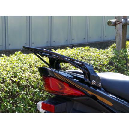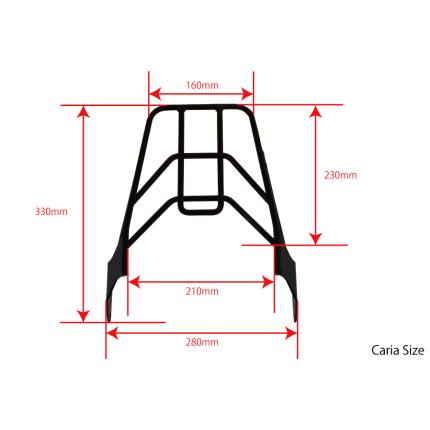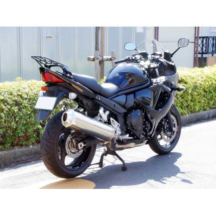 大きさ:天板(縦:230mm・横(もっとも狭い部分):160mm・横(もっとも広い部分):210mm)、キャリア本体(縦:330mm、横:280mm)、最大積載量:5Kg。マルチキャリアタイプ2のデザインコンセプトはCB1300と共通の「キレ」とし、 各部のパイプは直系9mmのパイプを使用し、取り付け部分の鉄板は3mmの板を使用しました。これらの部材を採用したことによってすっきりとしたデザインにする事が出来ました。パイプ部分は基本的に直線で構成しましたが、 取り付け板部分には 流れるような流線型デザインを一部採用しています。バンディット1250やGSX1400もテール周りがシャープにデザインされており、どの車種につけても車両のイメージを崩しません。また、CB750もCB1300SFもグラブバーが装着されておりパッセンジャーが掴むベルトがシートに装着されていないのでパッセンジャーがタンデムバーを掴めるようにグラブバーと天板の間を広めにとりました。結果的にGSX1400もバンディット1250もグラブバーが装着されていますが、どの車種につけてもグラブバーを掴む事が出来ます。ただし厚めのグローブを装着していると手が入らない可能性はございます。デザインコンセプトである「キレ」を実現する為に私たちが重視したのはリアキャリアの大きさです。あまり大きなリアキャリアにしてしまうと車体のイメージを大きく崩してしまいます。リアキャリアのサイズを決定するにあたり、二つの条件下での利便性を重視しました。リアボックス(トップケース)を装着する場合にベースを装着しやすい大きさであること。キャンプツーリングなどに行くときにリアボックスとリアシートを使って沢山の荷物をつめること。この二点です。リアボックスのベースを取り付けする時に各メーカーごとに若干は異なりますが、基本的にはリアキャリアにリアボックスを装着する為のベースを装着します。ベースを装着する際には波型のプレートを使用しますが、キャリア本体のデザインによっては、波型のプレートを二箇所で固定するのが難しい場合があります。その場合は、一箇所固定でも問題ありませんが、やはりしっかりと二箇所固定したほうが安心です。マルチリアキャリアの天板はリアボックスのベースを固定する波型プレートを二箇所固定で装着しやすい設計にしており、ほとんどのメーカーのリアボックスは装着可能です。マルチリアキャリアタイプ2が適合する車両全てタンデムグリップがシートよりも高い位置にある為、リアキャリアをグリップよりも少し高い位置に配置することで、シート、グリップ、リアキャリア三点のパーツで大きな荷物を積む事が可能にしています。また、各部の負荷を分散させる事にもなる為、より重い荷物を積載する事が可能です。車種専用アタッチメント付です。