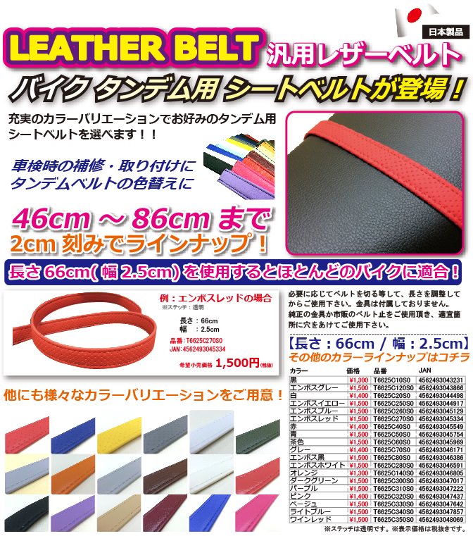 ※カラー:青/ステッチ:透明/長さ:84cm/幅:2.5cm車検時の補修・取り付けにタンデムベルトの色替えに46cm~86cmまで2cm刻みでラインナップ有り(本品は長さ:84cm/幅:2.5cm)必要に応じてベルトを切る等して、長さを調整してからご使用下さい。金具は付属しておりません。純正の金具か市販のベルト止をご使用頂き、適宜箇所に穴をあけてご使用下さい。グロンドマン汎用ベルトはオートバイのタンデムベルトとして使用できる丈夫な素材を使っております。穴あけ加工、取付金具を取り付けることによって、様々な用途に使用できます。)必要に応じてベルトを切る等して、長さを調整してからご使用下さい。金具は付属しておりません。純正の金具か市販のベルト止をご使用頂き、適宜箇所に穴をあけてご使用下さい。グロンドマン汎用ベルトはオートバイのタンデムベルトとして使用できる丈夫な素材を使っております。穴あけ加工、取付金具を取り付けることによって、様々な用途に使用できます。