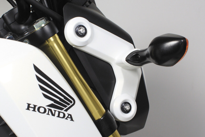 GROM・MSX125のヘッドライトカウルに装着するドレスアップパーツです。サイドカラー、ボルトはアルミを精巧に削り出し、表面にアルマイトを施すことでヘッドライト周りを美しく演出します。ボルトはシルバーになります。サイドカラー中央にはSP武川ロゴがレーザーマーキングされています。