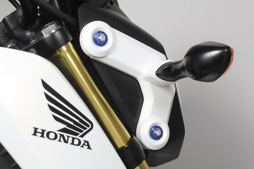 GROM・MSX125のヘッドライトカウルに装着するドレスアップパーツです。サイドカラー、ボルトはアルミを精巧に削り出し、表面にアルマイトを施すことでヘッドライト周りを美しく演出します。ボルトはシルバーになります。サイドカラー中央にはSP武川ロゴがレーザーマーキングされています。