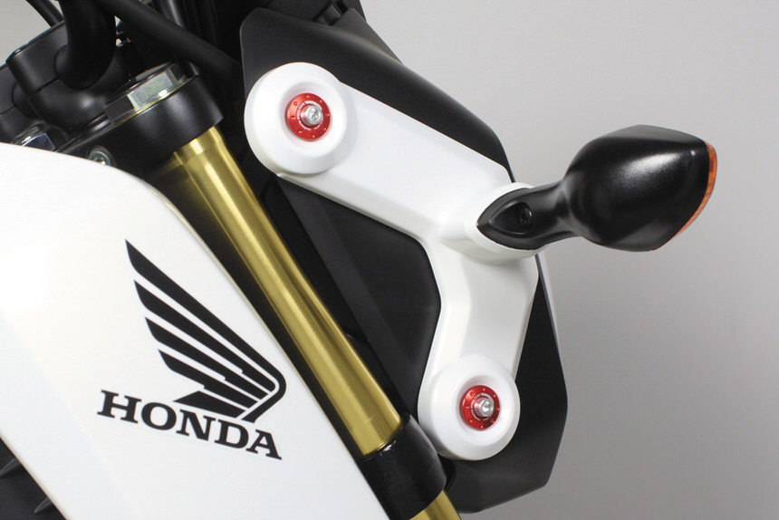 GROM・MSX125のヘッドライトカウルに装着するドレスアップパーツです。サイドカラー、ボルトはアルミを精巧に削り出し、表面にアルマイトを施すことでヘッドライト周りを美しく演出します。ボルトはシルバーになります。サイドカラー中央にはSP武川ロゴがレーザーマーキングされています。