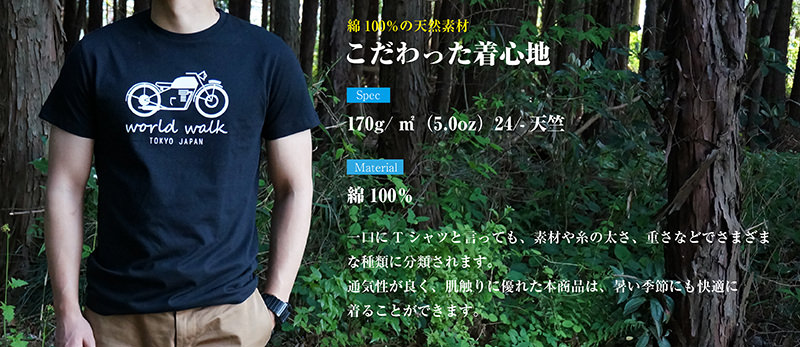 ※発送後のサイズ交換はお承りできません。サイズ表をご確認の上ご注文ください。スポーツスターをはじめ、様々な車種のパーツ開発を行っているワールドウォークからヘビーローテーションで着られる2種類のTシャツが登場しました。絵柄はリリースにあわせた書き下ろし。様々な着回しができるように、デザインはシンプルに。印刷は職人の手作業によるシルクスクリーン技法です。生地には綿100%の自然素材を使用しているため、肌触りよく通気性に優れています。「つねにバイクを感じていたい」、そんな貴方にこの夏おススメのTシャツです。Mサイズ:着丈68cm・身幅49cm・肩幅42cm・袖丈20cm、Lサイズ:着丈71cm・身幅52cm・肩幅44cm・袖丈21cm、XLサイズ:着丈74cm・身幅55cm・肩幅46cm・袖丈22cm。重さ:170g/平方メートル(5.0oz)。24番単糸・天竺編み。丸胴仕上げ。素材:綿100%。一枚ずつ職人の手作業で行われるシルクスクリーン印刷を採用。堅牢性・耐候性に優れていて、発色が良く鮮やか、インクを厚く盛れるため下地の影響を受けずらい特性があります。Classicデザインの特徴:多様化・細分化する混沌とした情報化社会に生きる現代人。そんな時代だからこそ、シンプルなものの美しさに目が奪われることがあります。このTシャツのモチーフは1950年代のクラシックバイクです。ABSはもちろんスクーターもありませんが、半世紀を過ぎてもなお多くの人を魅了しています。デザインに落とし込む際は、可能な限り情報を省略しごく単純な線と図形で構成しました。そうすることで生じたデザインの余白に、着る人が抱くストーリーやイメージを投影できるようにする狙いがあります。