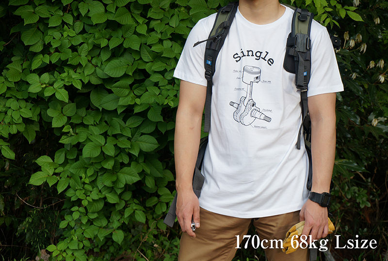 ※発送後のサイズ交換はお承りできません。サイズ表をご確認の上ご注文ください。スポーツスターをはじめ、様々な車種のパーツ開発を行っているワールドウォークからヘビーローテーションで着られる2種類のTシャツが登場しました。絵柄はリリースにあわせた書き下ろし。様々な着回しができるように、デザインはシンプルに。印刷は職人の手作業によるシルクスクリーン技法です。生地には綿100%の自然素材を使用しているため、肌触りよく通気性に優れています。「つねにバイクを感じていたい」、そんな貴方にこの夏おススメのTシャツです。Mサイズ:着丈68cm・身幅49cm・肩幅42cm・袖丈20cm、Lサイズ:着丈71cm・身幅52cm・肩幅44cm・袖丈21cm、XLサイズ:着丈74cm・身幅55cm・肩幅46cm・袖丈22cm。重さ:170g/平方メートル(5.0oz)。24番単糸・天竺編み。丸胴仕上げ。素材:綿100%。一枚ずつ職人の手作業で行われるシルクスクリーン印刷を採用。堅牢性・耐候性に優れていて、発色が良く鮮やか、インクを厚く盛れるため下地の影響を受けずらい特性があります。Singleデザインの特徴:エンジンの奥深く、過酷な環境で常に働いているクランクシャフトやピストン。そのスピードは一分間に数千~数万回という驚異的な速度です。トルク特性や鼓動感などバイクの味付けを左右する重要な部分ですが、目にしたことのない方も多いはず。そんなバイクのコアともいえるパーツを図解風にデザインし、フロントへ配置した一枚です。エンジンの歴史の中でも最も古い単気筒モデルをモチーフにしました。