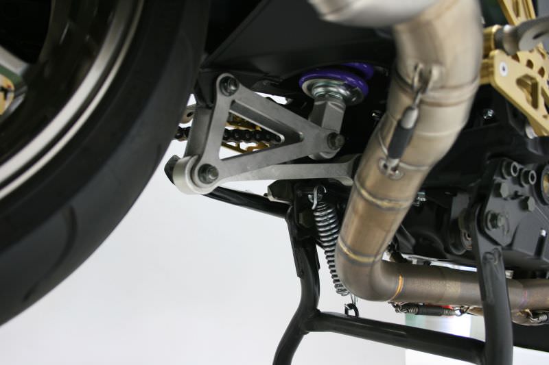 ※車両特性によって、純正状態でのスタンドの傾きは様々です。別の車両と比較するものではありません。※記載された数値分のショートスタンドを別途ご用意いただくか、純正スタンドを数値分カットしてください。※車体バランスを得るために、フロントのセッティングを推奨しています。タイプ:トライアングルストロークリミッター付属:無ローダウン量:30mm純正サイドスタンド角度:15°キット装着後サイドスタンド角度:9°サイドスタンド必要カット量:20mmフロントフォーク最大突出量:15mmリアサスペンションリンク部の交換で、ノーマルサスペンション位置を変更し、車高を下げるプレート。同時にスプリングをハイパープロ製に交換することももちろん可能です。車種別に最適な形状のキットを設定しています。また、車種によっては、ローダウンによるフルストローク時のバンピング(底付き)を防ぐストロークリミッターを付属します。