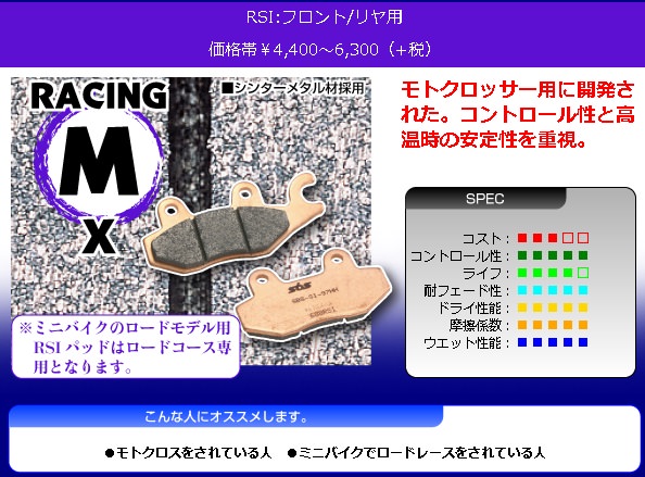 SBSブレーキパッドとは北欧デンマークに本社を置く、SBS社が手がけるブレーキパッドです。ブレーキパッドの世界NO,1シェアを誇り、自社販売はもちろんオートバイ、自動車のOEM供給に加え、レース等でのサポート等、研究、開発、販売を幅広く手がけています。SBSブレーキパッドは長く使用すればするほどライダーにとって優しく、頼れる性能を体感できることでしょう。ビギナーからプロレーサーまでライダーの意のままに操れるコントロール性と高い耐久性、そしてストリート、オフロード、レース等、用途に応じた多彩なバリエーションが魅力のブレーキパッドです。モトクロッサー用に開発された。コントロール性と高温時の安定性を重視。ミニバイクのロードモデル用RSIパッドは、ロードコース専用となります。【こんな人におすすめします】モトクロスをされている人 ミニバイクでロードレースをされている人フロント用