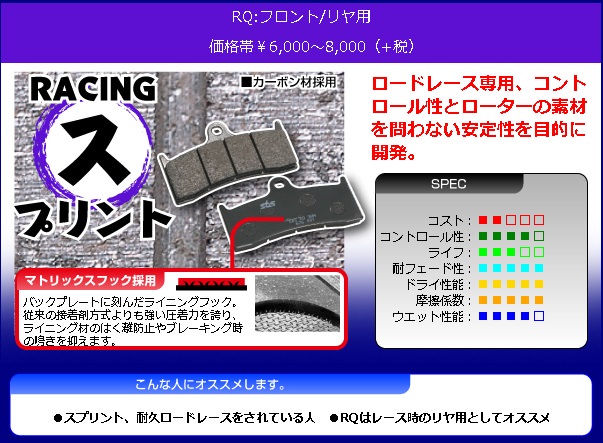 SBSブレーキパッドとは北欧デンマークに本社を置く、SBS社が手がけるブレーキパッドです。ブレーキパッドの世界NO,1シェアを誇り、自社販売はもちろんオートバイ、自動車のOEM供給に加え、レース等でのサポート等、研究、開発、販売を幅広く手がけています。SBSブレーキパッドは長く使用すればするほどライダーにとって優しく、頼れる性能を体感できることでしょう。ビギナーからプロレーサーまでライダーの意のままに操れるコントロール性と高い耐久性、そしてストリート、オフロード、レース等、用途に応じた多彩なバリエーションが魅力のブレーキパッドです。ロードレース専用、コントロール性とローターの素材を問わない安定性を目的に開発。【マトリックフック採用】バックプレートに刻んだライニングフック。従来の接着剤方式よりも強い圧着力を誇り、ライニング材のはく離防止やブレーキング時の鳴きを抑えます。【こんな人におすすめします】スプリント、耐久ロードレースをされている人、RQはレース時のリヤ用としてオススメ