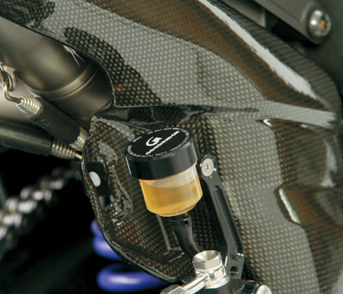 取り付けステー・ボルト・カラー・ホースが付属された、汎用タイプのリザーバータンクキット。アルミ削出しブラックアルマイトのキャップには、グッドリッジのロゴがレーザーで刻印されています。タンク取り出し:ストレートタンク容量:最大約17cc、最小約11ccダイヤフラム付きDOT4専用品