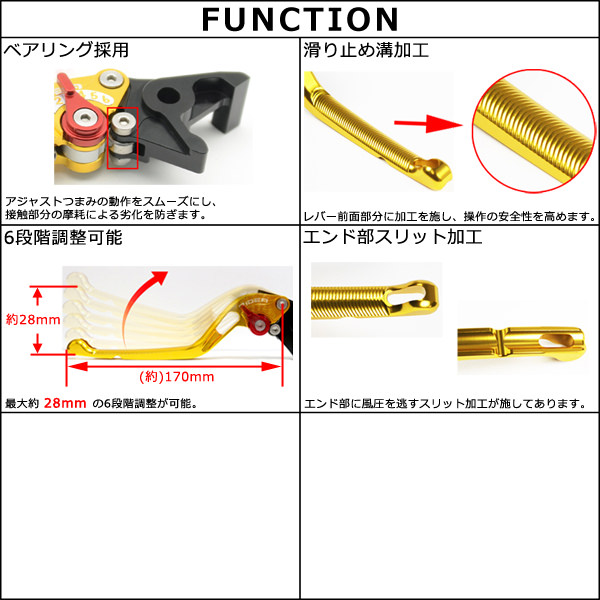 ※アジャスター(調整つまみ)は7色(ブラック/ゴールド/シルバー/ブルー/レッド/チタン/グリーン)よりお選びいただけます。※取り付け車種により純正レバーに付属する部品をご使用いただく場合がございます。※レバー交換後は必ず異常が無いか確認を行ってください。※モニターの環境等の理由により画像の色と実物の色が若干異なって見える場合がございます。※画像はイメージです。レバー本体カラー:ブルーレバー長さ:(約)170mm(FUNCTIONの画像をご参照ください※取り付けた際の角度によって長さに若干の誤差が生じます)純正のクラッチレバーホルダーに装着できます。高強度アルミニウム合金素材6061を精密加工したレバー本体にアルマイト処理を行うことにより高級感を与え、高精度を実現しました。つまみ部分の接触部にはベアリングを採用しているのでアジャストつまみの動作をスムーズにし、接触部分の摩耗による劣化を防ぎます。レバー前面部分には滑り止めの溝加工を施し、操作の安全性を高めます。6段階アジャスターにより最大約28mmまで調整が可能となっており、好みのレバー位置にセッティング可能です。レバーエンド部に風圧を逃すスリット加工が施してあります。メーカー品番:LV1-SL-RL076-BE
