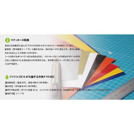 ※カラーサンプルは色彩イメージとなりまして、実際のお届け商品と色味が異なる可能性がございます。赤と黒のYZF-R25には貼られているリムステッカーが、青にだけ貼られていないため、本商品を作りました。リムステッカーのサイズ選定の際は1mmずつ幅を変えたものを貼り、最終的には車体デザインとのバランスが良かった4mm幅に決定しました。貼るだけでよりレーシーな雰囲気を醸し出します。またリム部分は乗るうちに小傷が増えていきます。リムステッカーを貼り付けることで物理的にリム表面を保護するため、小傷防止にもつながります。こちらの商品で車輌1台分の貼り付けが可能です。また予備のシールを4本おつけします。イラスト入りの貼り付けマニュアルが付属します。ステッカー素材の特徴:素材には柔軟性に富んだTOYOCHEMのダイナカルシリーズを使用しています。耐候性(屋外耐候性5~7年)に優れるため、雨の日もバイクに乗る方や、野外に駐輪する方も安心してご利用いただけます。シート自体に色がついているため発色が良く、ステッカーに仕上がる際はデザインの形状に沿って縁をカットし必要な部分だけを残すため、形が際立ちシャープに美しく仕上げることができます。TOYOCHEMが実施する各種テスト項目:【耐湿熱性】(温度65℃、湿度80%で168時間)。【耐水性】(40℃温水中に168時間)。【耐化学薬品性】(ガソリン浸漬30分、エンジンオイル浸漬30分、5%硫酸浸漬7時間、5%水酸化ナトリウム浸漬7時間)。【耐候年数】5~7年。カラーは以下8色から選択可能です。黒、青、金、橙、赤、銀、白、黄。
