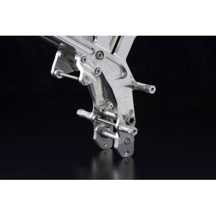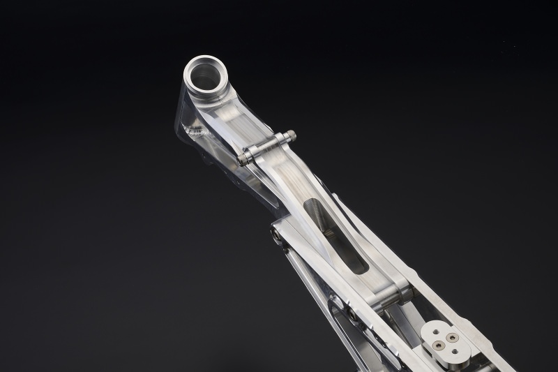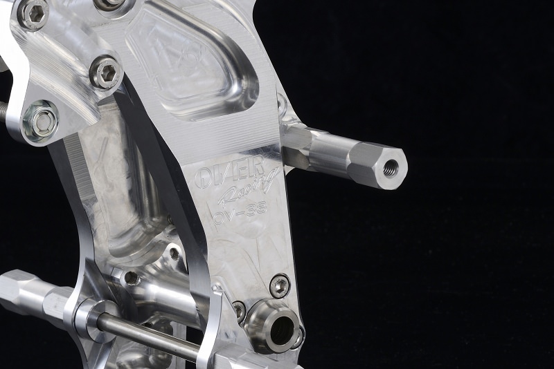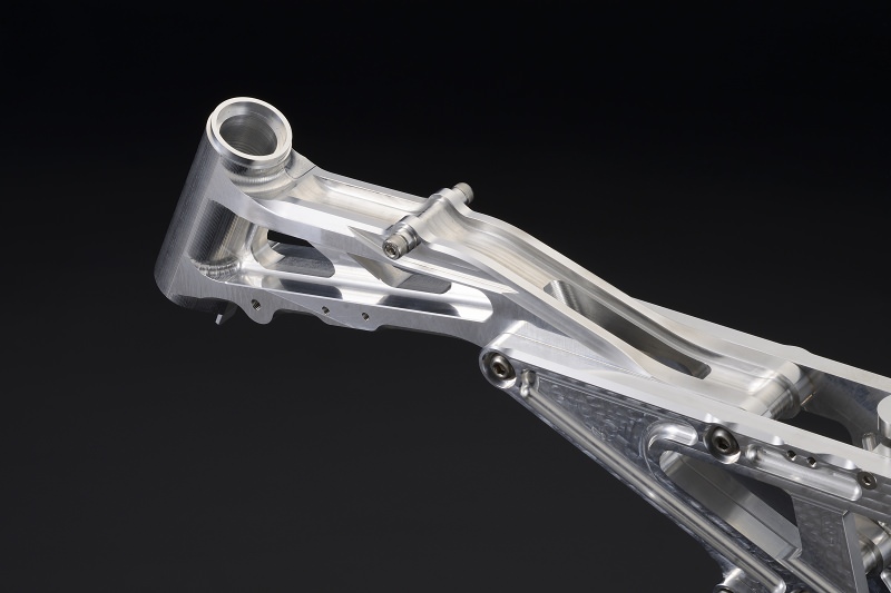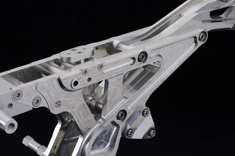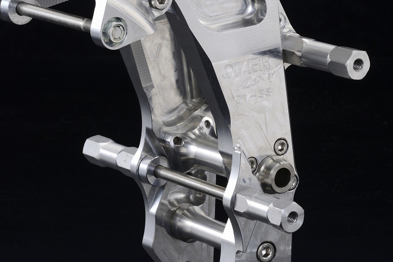 モンキーエンジン用新型フレーム『OV-38』の完成です。ハイスペック&パワフルエンジンの搭載を想定し、新製法と新たなアイデアを取り込んだ全てが新しいスペシャルフレームです。フレームを構成する根幹となるメインフレームは、30mmロング&キャスター角28度のOVフレームの方程式を受け継いだモノブロック方式。3次元テーパー加工を用いて貫通穴を施し、ハーネス類の処理と電装パーツのスペースを確保、タンク下やマウント方法を見直し、限られた条件の中で進化しています。新設計のV字フレームは、OV-38フレーム最大の特徴の一つ。シートレースプレートから延長したV字フレームは、メンイフレームと重ねて構成し、エンジンマウント部の横方向への剛性アップしています。ピボット部へとつながるエンジンマウント部は肉厚なアルミ材より削り出された3次元テーパ加工によるワンピース構造。内側にまで及ぶポケット加工とRエッジ加工はスタビリティの限界まで軽量化を追及しています。3次元加工によるエンジンハンガーも新設計パーツの一つです。ピボットプレート部に、面圧を高めたボルトオンのクワトロ形状を採用。軽量化にも貢献し、開きを抑制し四方向へのねじれを受け止める4本止めです。ステップ取り付け方法を見直し、フレームへのダイレクトマウントへ新設計しています。より精度の高いマウントを求め、フレームを通して伝わるライダーへのフィーリング感を高めました。