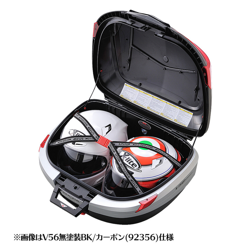 モノキーケースV56 MAXIA4シリーズ(W600×H330×D480)。樹脂製モノキー最大容量の56Lタイプ。プッシュダウンクローズシステム、セキュリティーキー、ボトムインナーマット標準装備。リフレクター赤、無塗装黒、カーボン調パネル仕様。※ベース別売り。車種別フィッティング(別売り)指定モノキーベース(M3/M5/M7いずれか)を使用。※最大積載重量(=ケース内収容物のMAX総重量)は10kg。操舵性を考慮し、デイトナではモノキーでも3kg以下を推奨。※防滴性を考慮した設計ですが完全防水ではありません。