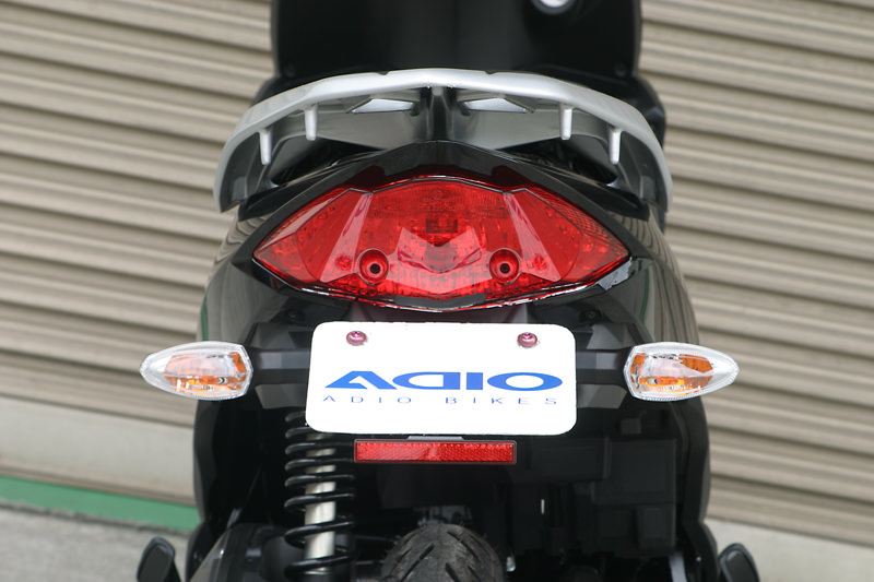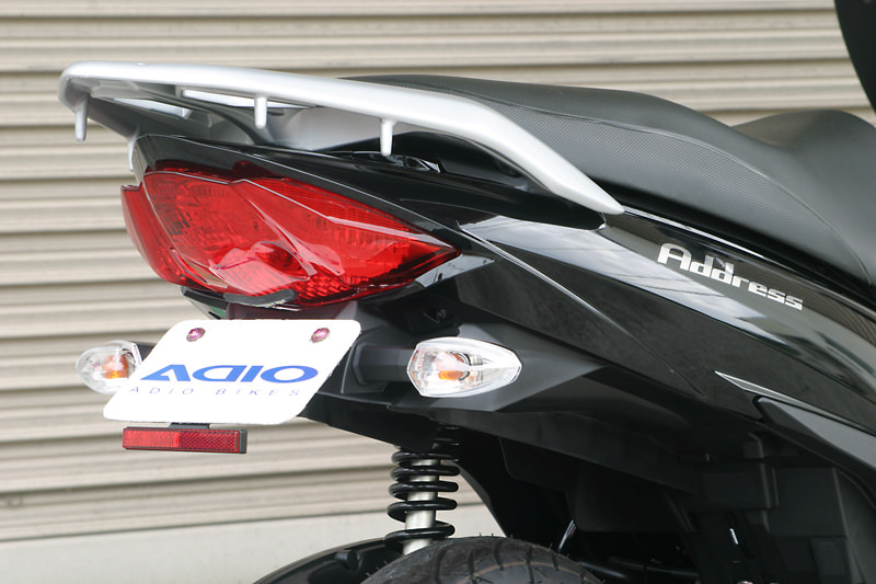 ※取り付けに際しては純正のリアフェンダーをカットする必要があります。小型で軽快、また燃費の良さで人気のアドレス110。しかし気になるのは、リアフェンダー。アディオのフェンダーレスキットはボディとナンバープレートを極力近づけ、シンプルでスポーティなリアビューを実現しています。純正ナンバー灯も取り外し、軽快感をプラスしています。LEDナンバー灯を付属。リフレクターステーも純正リフレクターを使用するタイプと、スリムリフレクターをセットにしたタイプの2種類の設定です。純正のナンバー灯も取り外し、キットに付属のLEDナンバー灯に変更することで、シンプルスタイルに磨きを掛けます。また、リフレクターステーも別体式にすることによって、取り外したりすることも可能です。LEDナンバー灯を取り付けるにあたり、配線加工が必要です。ナンバープレートが共振してビビリ音がでる場合があります。その場合は、防振ゴムを貼るなどの対応が必要です。