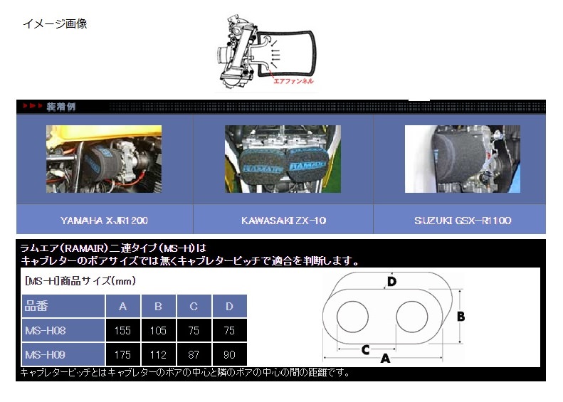 2連タイプ(4気筒には2個必要です)、レース専用部品・一般公道使用不可高性能キャブの性能をフルに発揮できる。低抵抗のポリウレタンフォームだから高性能キャブの性能をフルに楽しめます。直キャブに限り無く近い吸入抵抗なのでリセッティングの必要はありません。エアファンネルも重要なセッティングパーツです。そのエアフロー効果を十分 に利用できるのはラムエアだけです。エンジンに負担をかけない。抜群の集塵力によりエンジンの大敵であるホコリをほぼ100%カットします。キャブレターやエンジンのオーバーホール周期は大幅に伸び、寿命も延ばします。せまい隙間でも取付可能。ポリウレタンフォーム製なので、エンジン周りのクリアランスの無い車両でも取付可能です。着脱が簡単。ファンネルに被せるだけの簡単装着なので、すばやく脱着が可能です。メンテナンスもラクラク。超軽量でインシュレーターの負担軽減。エアクリーナーを外し重いパワーフィルターを装着すると、予想以上にインシュレーターに負担がかかりパーツの劣化を早めてしまいます。超軽量でインシュレーターへの負担を軽減し、クラック等による2次エアトラブルを防止します。