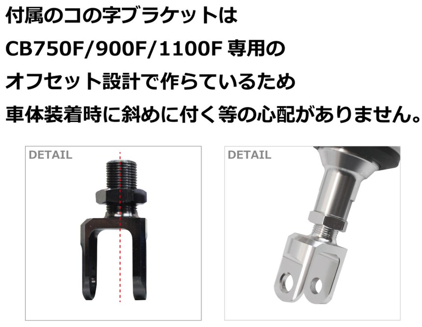 取り付け穴の中心~中心の長さ:約355mmスプリング長:205mmスプリング外径:65mmスプリング線径:8.1mmロッド径:12.3mm上側取り付け穴内径:16mm下側取り付け穴内径:10mm上側取り付け部の厚さ:18.3mm下側コの字部の内幅:20.1mm下側コの字部の外幅:29.6mmタンク径:49mm安心して使用できるサスペンションを提供するというコンセプトのもと、企画開発から製品化まで数多くの試行錯誤をくりかえして完成させたオリジナルのサスペンションです。サスペンションを構成している部品は低コストを実現するため海外の提携工場で生産を行い、最終組み立て及び窒素ガスの注入や出荷前の製品検査等の重要な作業は弊社の国内工場にて専門のスタッフが担当しています。安価なサスペンションに比べタンク容量を増量し、スプリング線径を1mm太く、スプリング外径を5mm大きくしていますので、柔らかすぎて乗り味がフワフワするようなことはありません。上下取付部のゴムブッシュは日本の工場で製造していますので劣化に強く純正と同じようにご使用になれます。安心してご使用いただけるように六ヶ月保証を付けています。※保証修理を依頼する場合は購入時に発行する保証書が必要になります。CB750F系専用設計のオリジナル「コの字」エンドアイが付いていますのでボルトオンで取付け出来ます。純正のサスペンションとほぼ同じ長さに設定出来ます。取付け穴の中心~中心の長さは約355mmでエンドアイを伸ばすと10mm延長可能です。スプリングプリロードが無段階に調整できます。減衰圧の調整はできません。プリロード調整レンチと六角レンチが付属します。