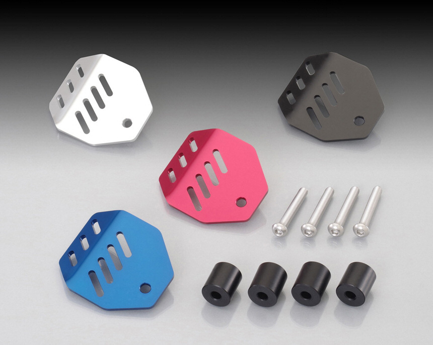 リアブレーキマスターシリンダーのリザーブタンクを転倒等の衝撃から保護します。ドレスアップも兼ねたアイテムです。アルミ製アルマイト仕上げ取付ボルト、カラー付属