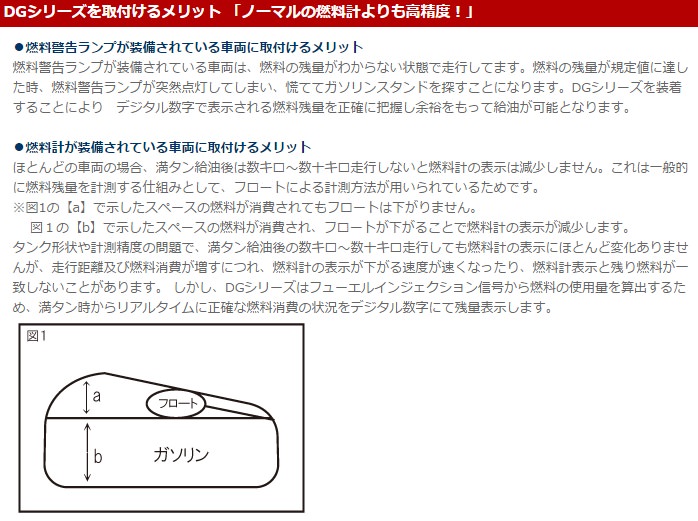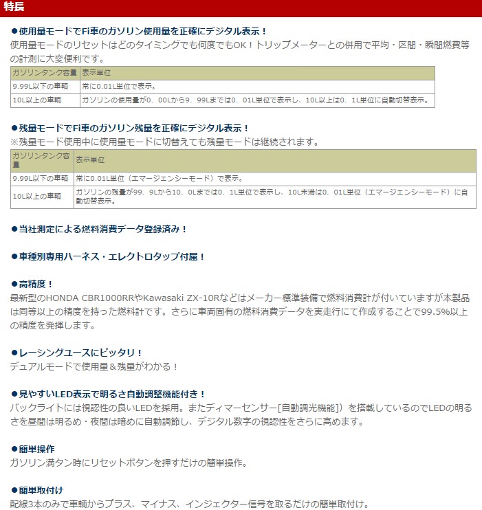 車両側の燃料タンク残量センサーを使用せずに、独自の燃料消費データをもとに計算して表示。燃料消費データ登録済みの専用キットです。【特長】使用量モードでは、ガソリン使用量を正確にデジタル表示。残量モードでは、ガソリン残量を正確にデジタル表示。燃料噴射をカットしている時は点滅表示します。見やすいLED表示で明るさ自動調整機能付き。簡単操作