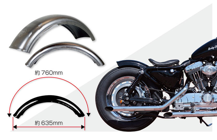 ※車種汎用品のため特定車両への適合は確認ができておりません。汎用のスチールフェンダー!各車種への取り付けは加工が必要となりますシンプルな6インチ幅のスチールフェンダー。断面形状は緩やかなラウンド形、ほのかなボブエンドがアクセント。