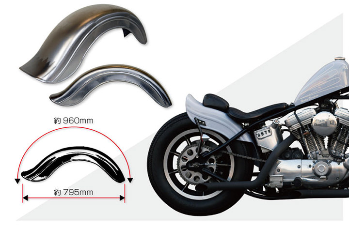 ※車種汎用品のため特定車両への適合は確認ができておりません。汎用のスチールフェンダー!ユニバーサルファットボブフェンダー。チェーンの逃がしは左側。取り付けには加工が必要。