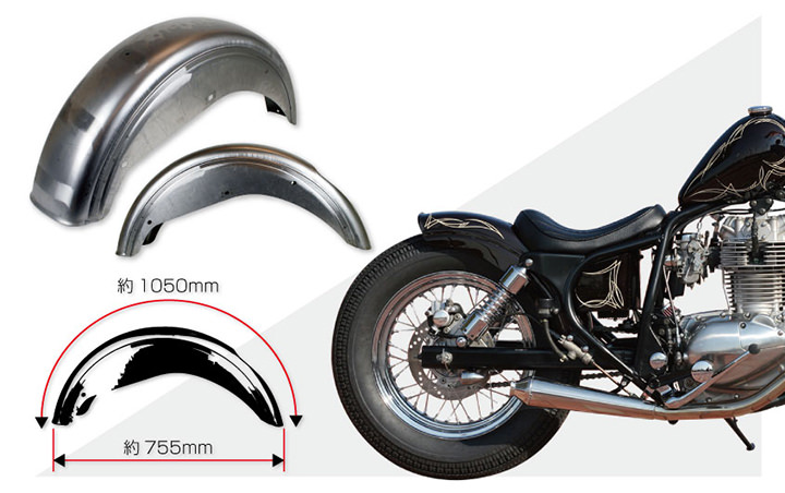 ※車種汎用品のため特定車両への適合は確認ができておりません。汎用のスチールフェンダー!ユニバーサルのスチールフェンダー。わずかなボブエンドがアクセントに。チェーンの逃がしは左側。取り付けには加工が必要。