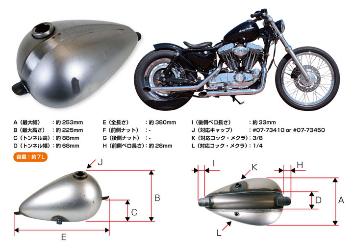 汎用タンクに必要な部品についてキャップをお選び下さいスチールタンクの場合・・アーリースタイル、 レイトスタイル、 キー付きキャップ(スチール用) が装着可能です。FRPタンクの場合(ティアドロップタンク除く)・・キー付きキャップ(FRP用) が装着可能です。コックをお選び下さいタンク装着時、どの位置にコックを付けるのかをご確認の上、適合するサイズとホース取り出し角度をお選び下さいガソリンコック一覧はこちらから プラグボルトをお選び下さいコックを装着しない箇所のコック受けを塞ぐ必要が御座います。塞ぐ穴のサイズをご確認の上お買い求め下さいプラグボルト一覧はこちらから フューエルフィルターはいかがですかタンク内部の不純物をキャッチするフューエルフィルターの装着をお奨め致します。