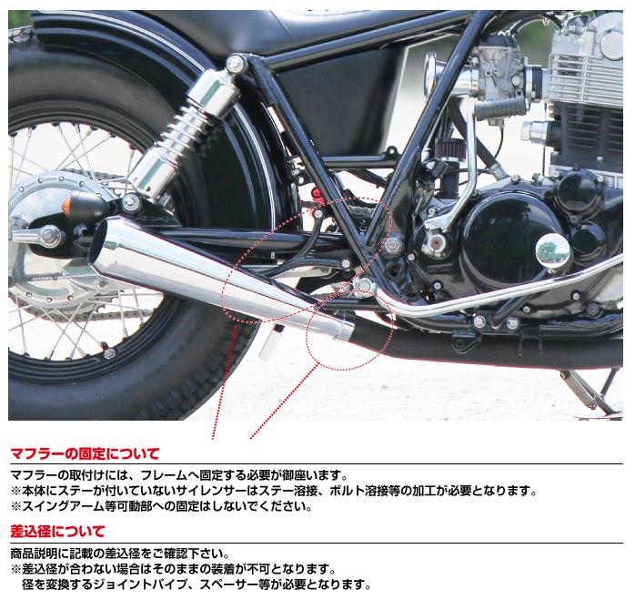 ※車種汎用品のため特定車両への適合は確認ができておりません。フィッシュテールエンド形状のユニバーサルマフラー!加工、工夫し装着下さい!フィッシュテールエンドのサイレンサー。ご注意下さい※インナーサイレンサー無し※本体固定ステー無し※各車種、そのままでは取り付けが出来ません。詳細は以下画像にてご確認下さい対応差込径1-3/4インチ(45mm)に対応
