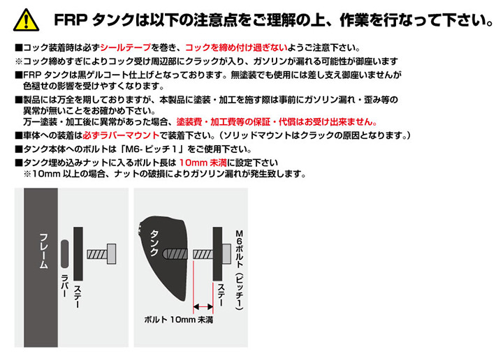 FRP・黒ゲルコートについて・FRPは元々黒色ですが、これは塗装の黒ではなく「キレイな黒色」では御座いません。そのままの使用も可能ですが、経年による変色、薄れが出てきますので塗装される事をお奨め致します。・FRP製品は製造工程上の型抜きの際などに避けることの出来ない擦れ傷が生じます。また、若干の色褪せについても「FRP製品の許容範囲内」とさせて頂きます。あくまでも塗装の下地としてご理解下さい。 ・FRP製品は、無理に力を加えると割れ等の症状がでる場合があります。