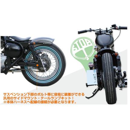 ※車種汎用品のため特定車両への適合は確認ができておりません。サスペンション下部ナットやフレームに装着!汎用のサイドナンバーキット主にサスペンション下側のナット(ボルト)に取付けする汎用のサイドナンバーキット。ご注意下さい※配線は車体側ハーネスへ接続する必要が御座います※配線色にご注意下さい(アース=黄色)※結線ミスなどで「常にテールランプが付いた状態」になっていた場合、レンズが溶ける恐れが御座います。SR400/500へ装着される場合SR特有の振動による割れを防止する為のカラーが付属したものが御座います。配線色黄色:アース / 黒:テール / 赤:ストップ内容物サイドナンバーステー×1、テールランプ×1、テールランプステー×1、取付ボルト×一式サイズサイドナンバーステー本体サイズ、図面主な取付けYAMAHADRAGSTAR250 * VIRAGO250 * SRV250 * RENAISSA * XS650KAWASAKI250TR * W650 * W400HONDASUZUKIGRASSTRACKER * ST250 * VOLTY