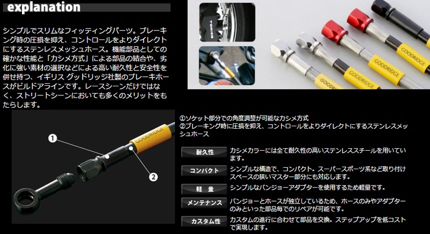 ※画像はカラーイメージ画像となります。実際の商品仕様と異なる場合がございます。ご了承くださいませ。タイプ:ノーマル交換タイプ前後・種別:リア用/2本取り廻し:フィッティング素材:ステンレスフィッティングカラー:ブラックホースカラー:ブラックホースホース素材:ステンレスメッシュシンプルでスリムなフィッティングパーツ。ブレーキング時の圧損を抑え、コントロールをよりダイレクトにするステンレスメッシュホース。機能部品としての確かな性能と「カシメ方式」による部品の結合や、劣化に強い素材の選択などによる高い耐久性と安全性を併せ持つ、イギリス グッドリッジ社製のブレーキホースがビルドアラインです。レースシーンだけではなく、ストリートシーンにおいても多くのメリットをもたらします。【特徴】耐久性カシメカラーには全て耐久性の高いステンレススチールを用いています。コンパクトシンプルな構造で、コンパクト。スーパースポーツ系など取り付けスペースの狭いマスター部分にも対応します。軽量シンプルなバンジョーアダプターを使用するため軽量です。メンテナンスバンジョーとホースが独立しているため、ホースのみやアダプターのみといった部品毎でのリペアが可能です。カスタム性カスタムの進行に合わせて部品を交換。ステップアップを低コストで実現します。