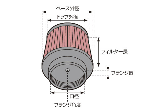 ※TMR/FCRへの装着には別売りのフィルターアダプターが必要です。※汎用品のため事前にフィルター装着スペースをご確認ください。ラウンドテーパード(ラバートップ)テーパーによって装着スペースを確保したラウンド形状のモデル。口径(mm):Φ110ベース外径(mm):145トップ外径(mm):98フィルター長(mm):163フランジ長(mm):15フランジ角度(度):0