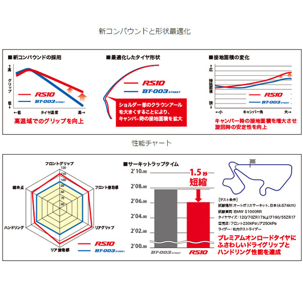 TL(チューブレスタイプ)タイヤサイズ:120/70ZR17 M/C (58W) TL標準リム幅(インチ):3.50適用リム幅(インチ):3.00~3.50外径(mm):601トレッド幅(mm):121「Another World」 これがMotoGPライダーが求めた感覚だ!新コンパウンドの採用と、タイヤ形状の最適化により、高いドライハンドリング性能とグリップ性能、安定性を実現したブリヂストンの新たなプレミアムハイグリップラジアル。スリックライクな新トレッドパタンは、トレッド剛性を向上させるために3Dの溝形状を採用。走り出しからわかる、路面を「掴む」感覚をブレーキングで、コーナリングで味わってもらいたい。こんなお客様におすすめ●ワインディングからサーキットまで幅広く走行されるお客様へ。●ドライ路面でのスポーティーで高い運動性能をお求めのお客様へ。●BATTLAX HYPERSPORT S20EVO/S20のドライグリップでは満足できないお客様へ。