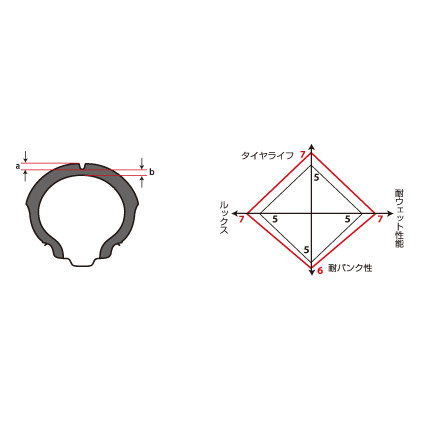 TL(チューブレスタイプ)タイヤサイズ:80/100-10 46J標準リム幅(インチ):1.85許容リム幅(インチ):1.85~2.15外径(mm):415トレッド幅(mm):83「アーバンマスター」の異名どおり、街中をキビキビ、そしてガンガン走るにはぴったり! 90年~125ccクラスのミドルスクーターに最適で、「雨天でも走る、パンクは困る」といった、普段の移動手段としてスクーターに乗る人のニーズにも過不足なく応える。構 造:実用域での扱いやすさを第一に、センターラジアスを大きくとり接地面を拡大。耐摩耗性に優れ、アンダートレッドを厚くすることで釘やガラス片などのパンクにも強い。a/従来のモデルに比べ、トレッド溝は20%深いb/従来のモデルに比べ、アンダートレッドは25%厚いパターン:さまざまな走行を想定し、パターンネガ比(トレッド面における溝の比率)を26%に。排水性能に優れ、ウェットな路面でも安心して走行できる。コンパウンド:構造・パターン同様、あらゆる走行シーンを想定したコンパウンドを採用。ドライでもウェットでも地面をしっかりグリップ。また、ロングライフも考慮した。