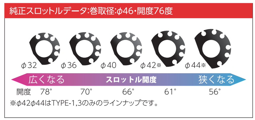 巻取径:Φ36ホルダーカラー:Tゴールドワイヤー金具:メッキアクティブ スロットルキットは、6サイズのインナーパイプ(TYPE-2は4サイズ)を交換することで、乗りやすさの要となるアクセル操作のセッティングを可能にします。巻取径を大きくして、少ない手首の返しで瞬時にワイドオープンさせる仕様もよし、逆に小さくして、より繊細なコントロール性能を得るもよし。あなたのバイクスタイルに合ったスロットルを手に入れてください。