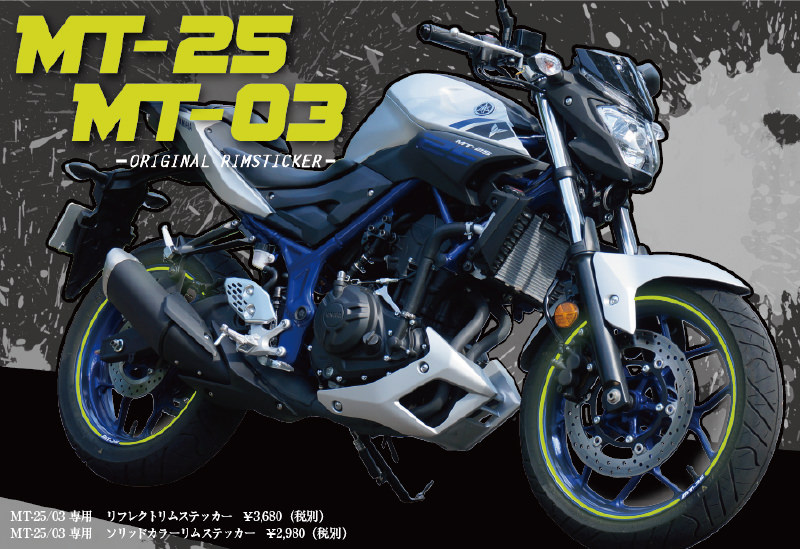 ※車両一台分の前後左右分と予備のステッカーがセットになります。MT-25専用デザインのリムステッカー。二輪免許でも乗れるMT-25&MT-25がついに登場!発売に合わせワールドウォークでは専用リムステッカーをご用意しました。足元がグッと締まり、レーシーな雰囲気を醸し出します。デザインにMT-25の車種名が組み込まれているため、存在感がアップすること間違いなし!反射素材を使用したリフレクトリムステッカーは、対向車のヘッドライトの光に反応するため、夜間時の視認性抜群です。またバイクに乗っていれば、飛び石や洗車などによってリム部分は多かれ少なからず傷がついてしまうもの。ステッカーを貼り付けることで物理的にリム表面を保護するため、小傷防止にもつながります。ステッカーは耐候性に優れた素材を使用するため、雨の日もバイクの乗る方や野外に駐輪される場合にも安心してご利用可能です。リムステッカーの幅はYZF-R25・R3同様、車体とのバランスが良くスポーティーな印象を与える4mm。カラーバリエーションは全8色。反射素材(リフレクト)2色と、ソリッドカラー6色をご用意しました。どちらのシートも耐久性と発色優れたシートを使用しているため、オートバイのステッカーに最適です。※リフレクトリムステッカーの文字部分は非反射素材です。※予告無く価格・デザインが変更される場合がございます。