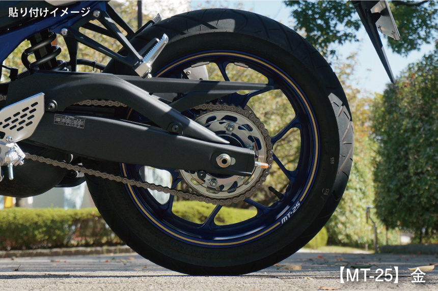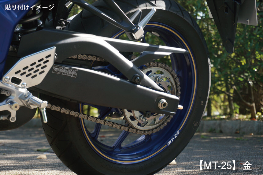 ※車両一台分の前後左右分と予備のステッカーがセットになります。MT-25専用デザインのリムステッカー。二輪免許でも乗れるMT-25&MT-25がついに登場!発売に合わせワールドウォークでは専用リムステッカーをご用意しました。足元がグッと締まり、レーシーな雰囲気を醸し出します。デザインにMT-25の車種名が組み込まれているため、存在感がアップすること間違いなし!反射素材を使用したリフレクトリムステッカーは、対向車のヘッドライトの光に反応するため、夜間時の視認性抜群です。またバイクに乗っていれば、飛び石や洗車などによってリム部分は多かれ少なからず傷がついてしまうもの。ステッカーを貼り付けることで物理的にリム表面を保護するため、小傷防止にもつながります。ステッカーは耐候性に優れた素材を使用するため、雨の日もバイクの乗る方や野外に駐輪される場合にも安心してご利用可能です。リムステッカーの幅はYZF-R25・R3同様、車体とのバランスが良くスポーティーな印象を与える4mm。カラーバリエーションは全8色。反射素材(リフレクト)2色と、ソリッドカラー6色をご用意しました。どちらのシートも耐久性と発色優れたシートを使用しているため、オートバイのステッカーに最適です。※リフレクトリムステッカーの文字部分は非反射素材です。※予告無く価格・デザインが変更される場合がございます。