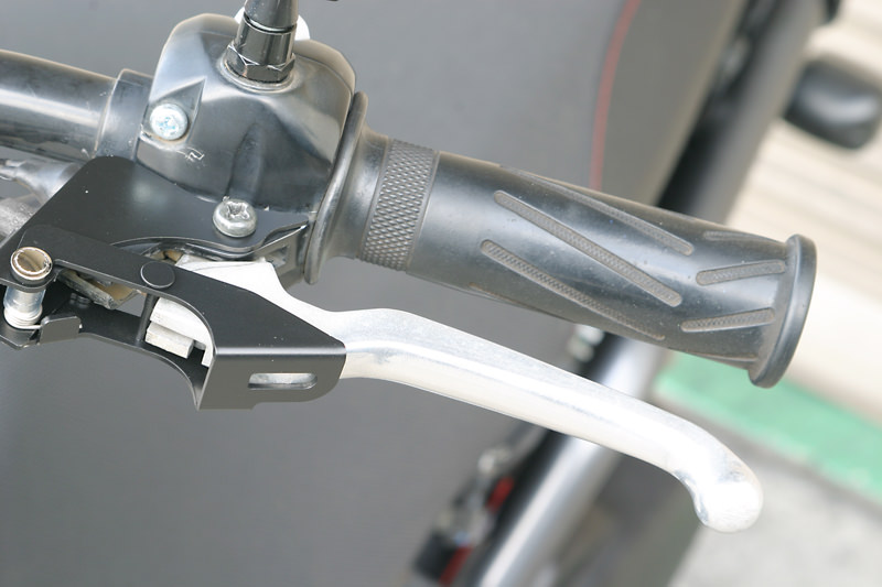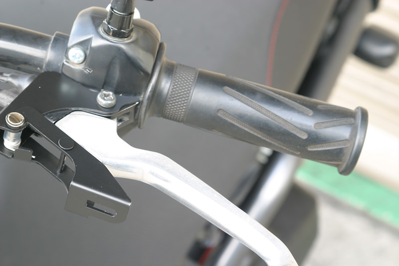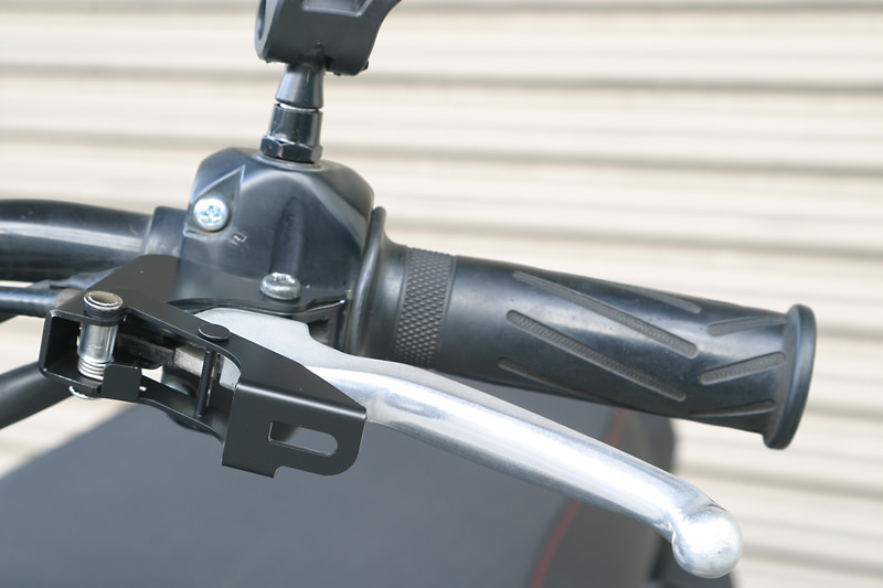※ブレーキストッパーのシャフトがうまくブレーキレバーを固定するようにリアブレーキワイヤー調整を行ってください。BWS125に付いていないパーキングブレーキをボルトオンで装着。坂道での駐車も安心です!BW'S125にはパーキングブレーキが付いていません。しかしスクーターの場合は、ギアを入れて止めることができないために、坂道での駐車は危険です。ブレーキストッパーは、リア(左)のブレーキレバーをロックしてブレーキが効いた状態で固定できます。またブレーキレバーを強く握ることで自動的に解除。ボルトオンで装着でき安心と安全を実現した便利な機能パーツです。BWS125には、パーキングブレーキが装備されていません。スクーターは坂道に駐車する場合、ギアを入れることもできず、サイドスタンドが外れて転倒の危険性があり安心できません。ブレーキストッパーは、簡単に装着できるパーキングブレーキレバーです。坂道での駐車や、信号待ちでのブレーキロックなど、とっても便利な商品です。安心と安全を得られる機能商品でもあります。ブレーキストッパーは、ブレーキレバーを握りながら、Pレバーを手前に引くだけです。ブレーキレバーの隙間にシャフトが入り込み、そのままロックします。また、ブレーキレバーを強く握るだけで、スプリングの力で自動的に解除されます。Pレバーは、通常のブレーキ操作の妨げにならないように、大きさも考えられています。形状もパーキングの「P」の文字を模ったデザインとなっています。リアブレーキレバーを止めているボルトナットで共締めするだけの簡単取り付けです。